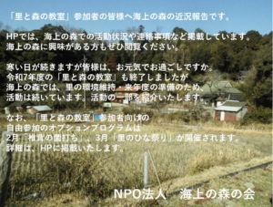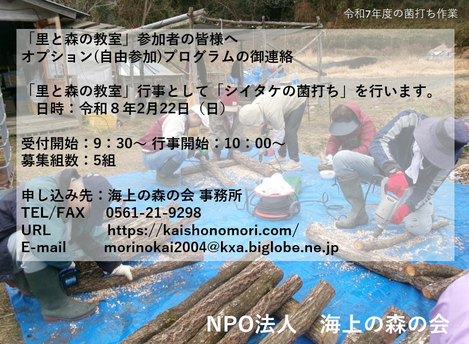 「里と森の教室」参加者の皆様へ 「シイタケの菌打ち」について。 2026年1月27日 最終更新日時 : 2026年1月27日 sato_G オプション(自由参加)プログラムとして「シイタケの菌打ち」を行います。